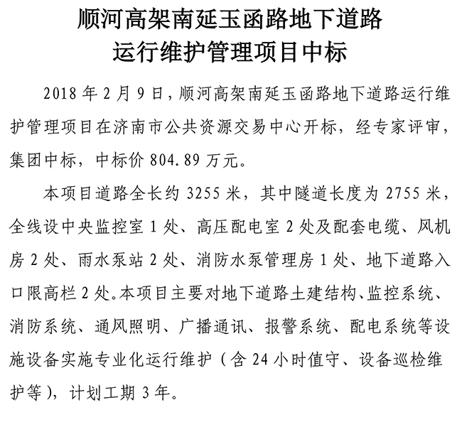 顺河高架南延玉函路地下道路 运行维护管理项目中标